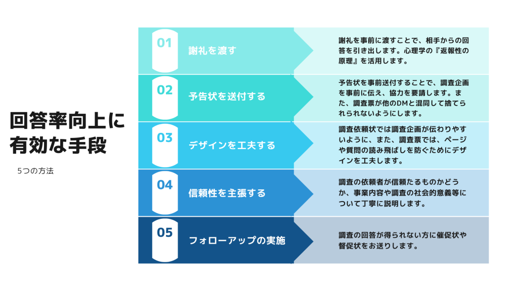 回答率向上に有効な手段として5つの代表例があります。この5つに関しては、過去の研究者の皆さんが発表している論文などで有効性が確認できているものになります。各手段について詳しく説明しますね!