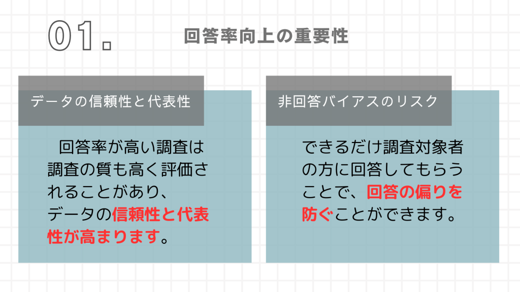 調査テーマは、回答者の興味や関心を引くような説明をすることが大切です。研究によれば、対象者が興味を持つテーマであれば、回答率が高まる傾向があります。したがって、調査設計の段階で、「調査テーマ」に対して回答者がどのような関心を持つのか検討することが重要です。